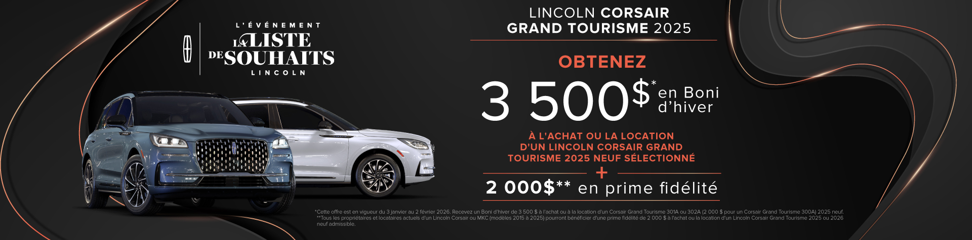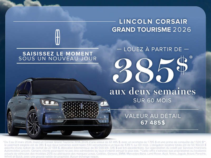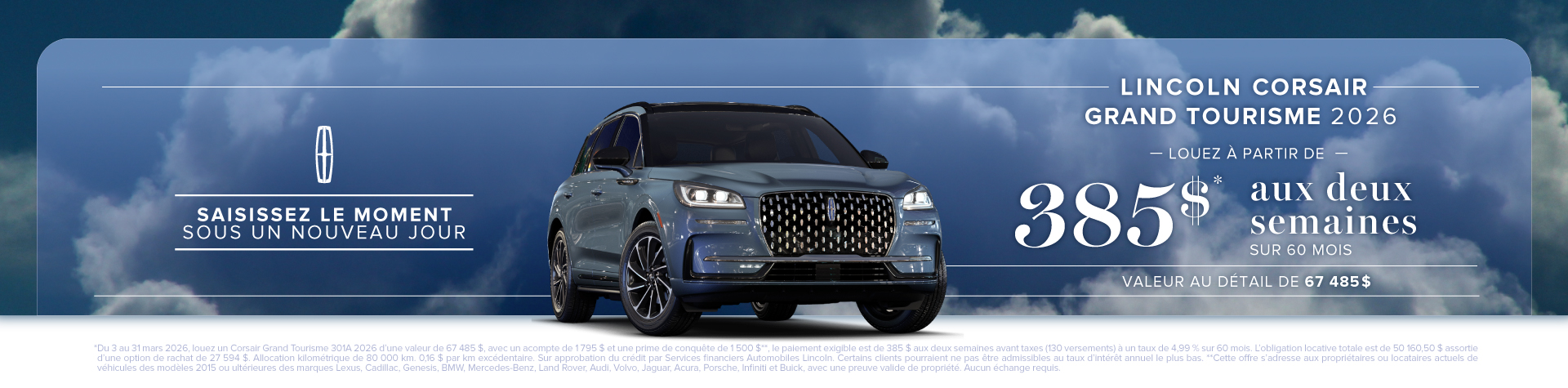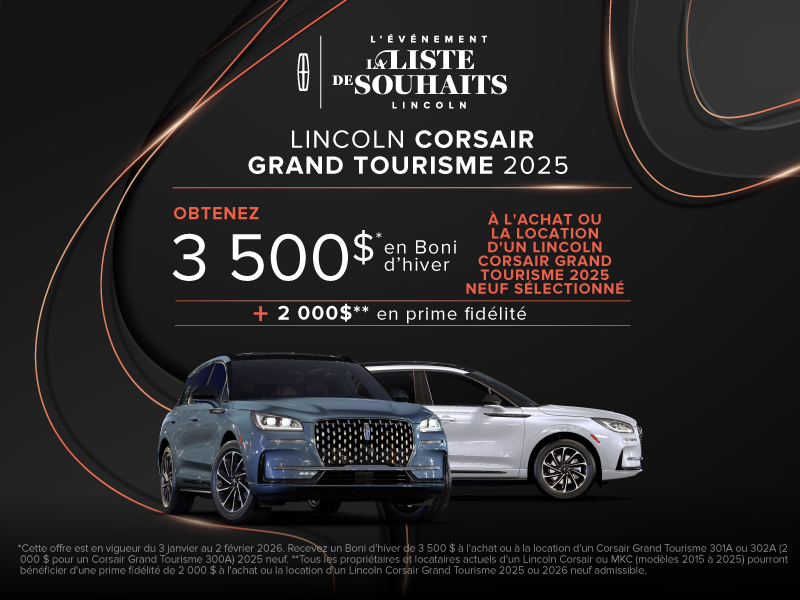 Le Corsair 2026 est offert en versions Standard, Reserve et Grand Touring PHEV. Chaque niveau de finition se distingue par une présentation exclusive, du cuir Bridge of Weir au placage en bois véritable. De nouvelles options apparaissent cette année, dont un ensemble hivernal repensé. Les ensembles d’assistance à la conduite sont plus complets, et un nouveau système de filtration de l’air, actif en continu, assure un habitacle plus sain. Le hayon électrique et les lumières d’accueil sont de série sur toutes les versions et rendent votre véhicule plus hospitalier que jamais. Lincoln c’est la réponse parfaite aux besoins des familles et des conducteurs recherchant le luxe en format compact.
