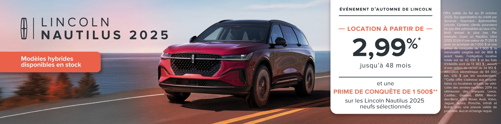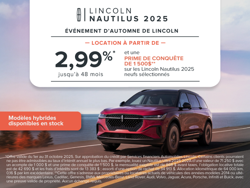 Le Nautilus propose des mécaniques efficaces, puissantes et économiques. Avec une consommation mixte estimée à 8,7 L/100 km pour le modèle hybride, le Lincoln Nautilus présente une des meilleures cotes de la catégorie. Il met également l’accent sur la durabilité avec des options de cuir végétalien et des garnitures en bois certifié. Toutes ces qualités ont valu au Lincoln Nautilus 2025 le titre de VUS de l’année du magazine américain Car and Driver.